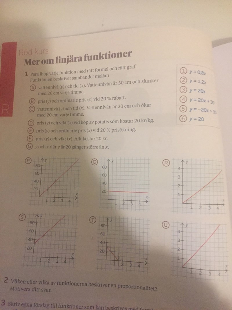 hej förstår inte fråga 1B där man ska para ihop varje funktion med rätt graf och formel. Har kollat noggrant på graf R för det är svaret i facit men jag fattar inte riktigt dedär med 20% rabatt. ska 2 i X-led säga ifall det är 20%