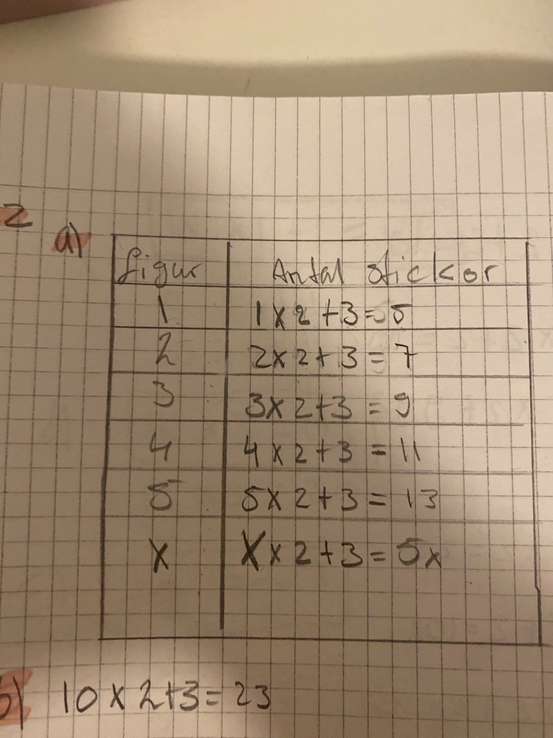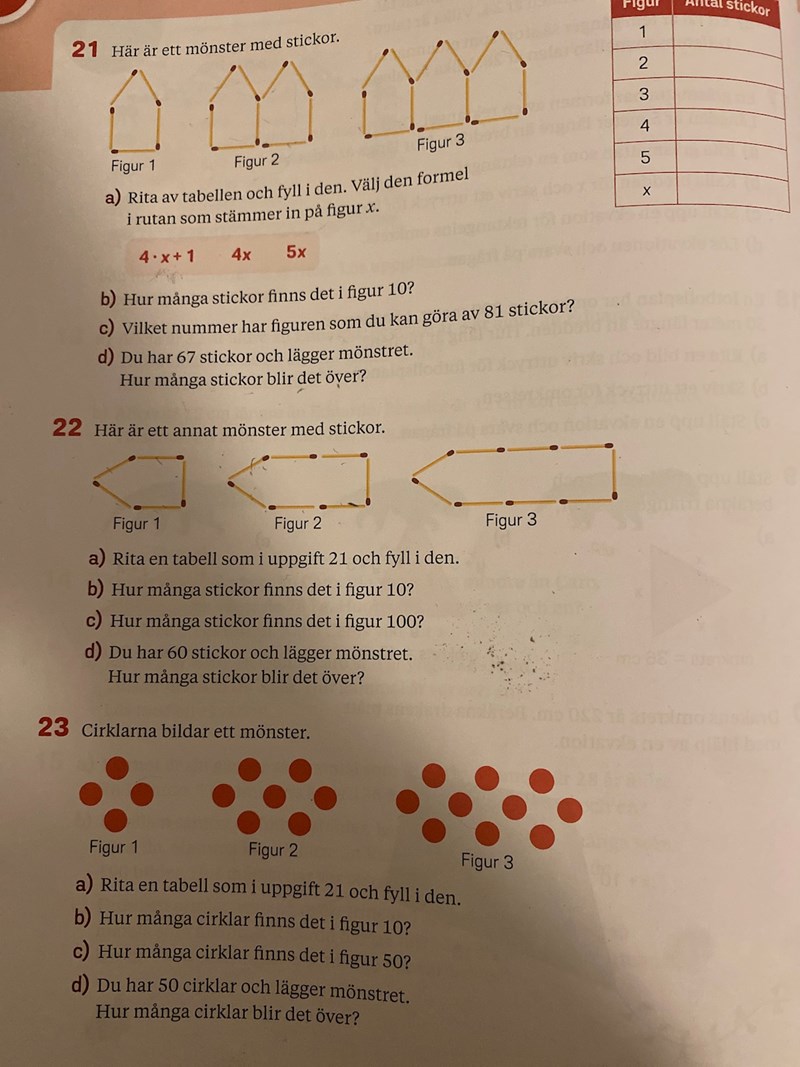 Jag kunde inte skriva men ifall jag kan få hjälp på uppgift 23 a ) bara figur ett löser jag resten för meningen är att ifall jag säger 1×2+1 ett på figur ett så måste jag säga samma sak på figur två fast då ändrar jag figur numret så då blir det 2×2+1 och det funkar inte på figur två så det måste vara samma ekvation fast man ska kunna byta figur numret och det ska bli så många cirklar i mönstret som det är figurerna. Det finns en bild på uppgift 22 ifall ni inte fattar!