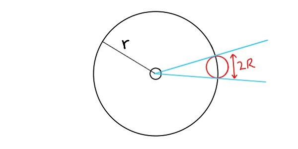 Bilden visar solen och Merkurius (inte i närheten av skalenligt). Merkurius är på känt avstånd r från solen. Merkurius radie är R (känt värde).