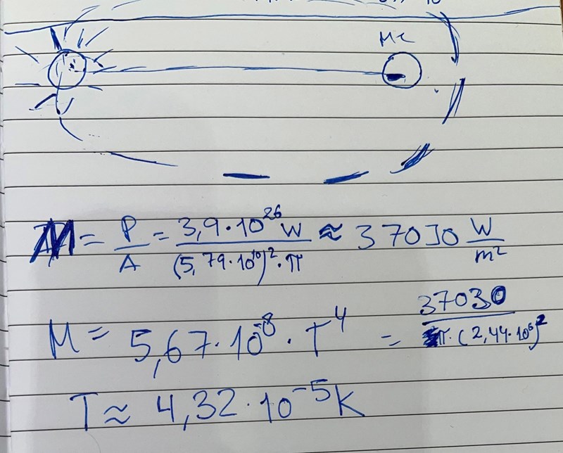 Till slut så behöver du approximera att Merkurius är en svartkropp och använda Stefan-Boltzmanns lag. Den del av planeten som är vänd mot solen ska då stråla ut lika mycket som det strålar in på den (p.g.a antagen strålningsjämvikt.)