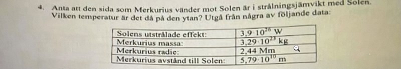 Försök att beräkna hur stor andel av solens utstrålade effekt som träffar Merkurius. Det mesta missar.