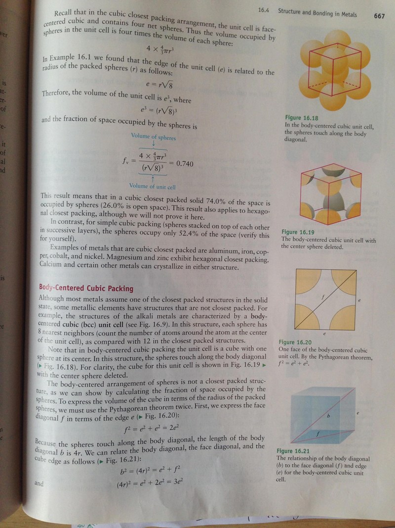 Bild 2: över rubriken "body centered Cubic packing" pratar man om hur uträkningen just ovan kommit fram till hur mkt utrymme i face centered cubic packing som upptas av atomer och hur mkt som är tomrum. Och man säger att det samma gäller för hexagonal tätpackning.
