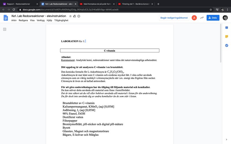 Teraeagle skrev:Skriv lite om vad redoxtitrering är för något och kanske lite grundläggande fakta om C-vitamin som kan vara relevant för laborationen, t.ex. strukturformel och det faktum att det går att oxidera ganska lätt. Vilka delar av molekylen är det som oxideras och vad får man då?