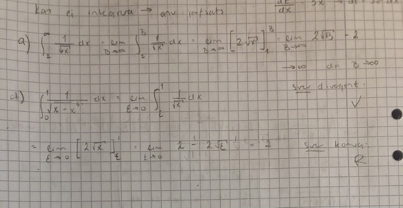 Problemet med a)-uppgiften är att din större funktion är divergent. Om du ska undersöka divergens/konvergens hos integralen , om för alla x i intervallet, och integralen av g(x) (över samma intervall) är divergent, kan du dra slutsatsen att integralen av f(x) är divergent.