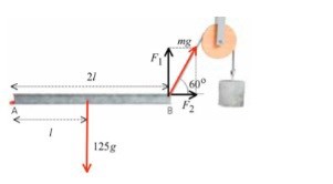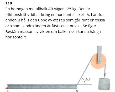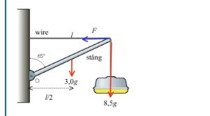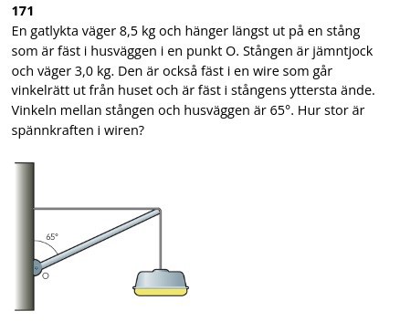 I den nedre figuren står det att wiren är _fäst_ i stångens yttersta ände. Det är alltså en helt annan wire som spännkraften ska räknas i, än den som gatlyktan hänger i. I wiren som gatlyktan är upphängd i så är spännkraften mg.