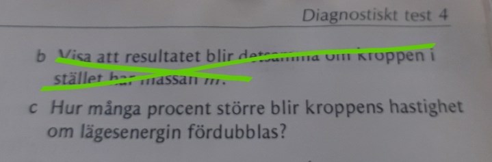 Det står även i facit att "En fördubbling av lägesenergin innebär enligt texten att rörelseenergin fördubblas."