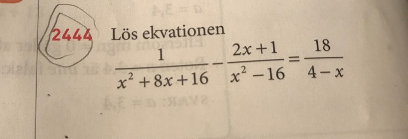 Jag har stora problem med denna denna ekvation. Jag ser att jag kan faktorisera nämnare, men vad är MGN? Försökte multiplicera VL och HL med (x+4)^2 (x-4). Det blev ju väldigt långt svar och fick fel på slutet :(. Är MGN rätt och jag måste gjort något fel?