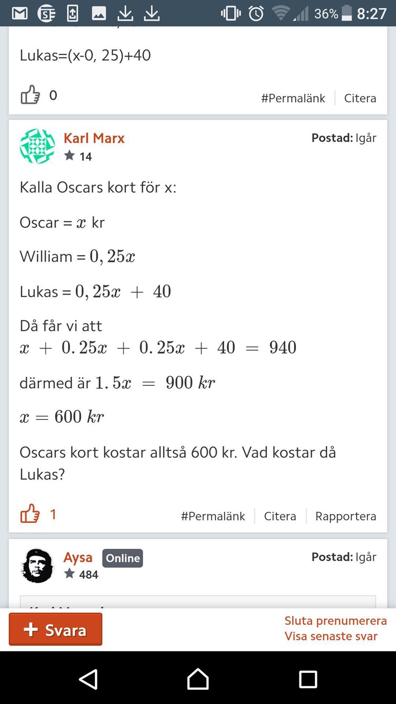 • Lucas betalar 0,75x + 40 kr.