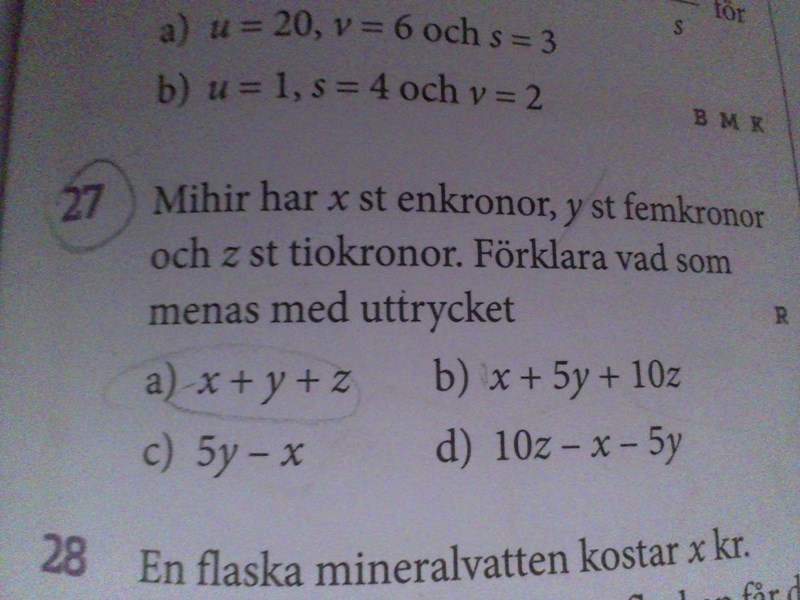 Jag förstår inte på 27 (B) frågan x+5y+10z kan någon hjälpa mig hur man löser denna uppgiften steg visst. Hur kan jag veta vad som menas med denna uttrycket?