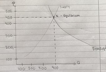 Beräkna marknadens jämviktspris och jämviktskvantitet samt visa i diagram. Var noga med att också förklara i egna ord processen bakom att jämvikten på en marknad etableras. Alltså, varför kan jämvikten förväntas hamna i skärningen mellan utbud och efterfrågan? Förklara och motivera resonemanget om processen samt knyt till diagrammet.
