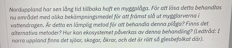 mag1 skrev:Detta är några saker som användningen av bekämpningsmedel av mygg kan leda till. Finns det några fler sätt ekosystemet kan påverkas av med denna behandling? Påverkas skogar och åkrar på något sätt? I frågan så står det även att Nord Uppland är glesbefolkat, hur kan jag använda mig av den infon för att besvara frågan?