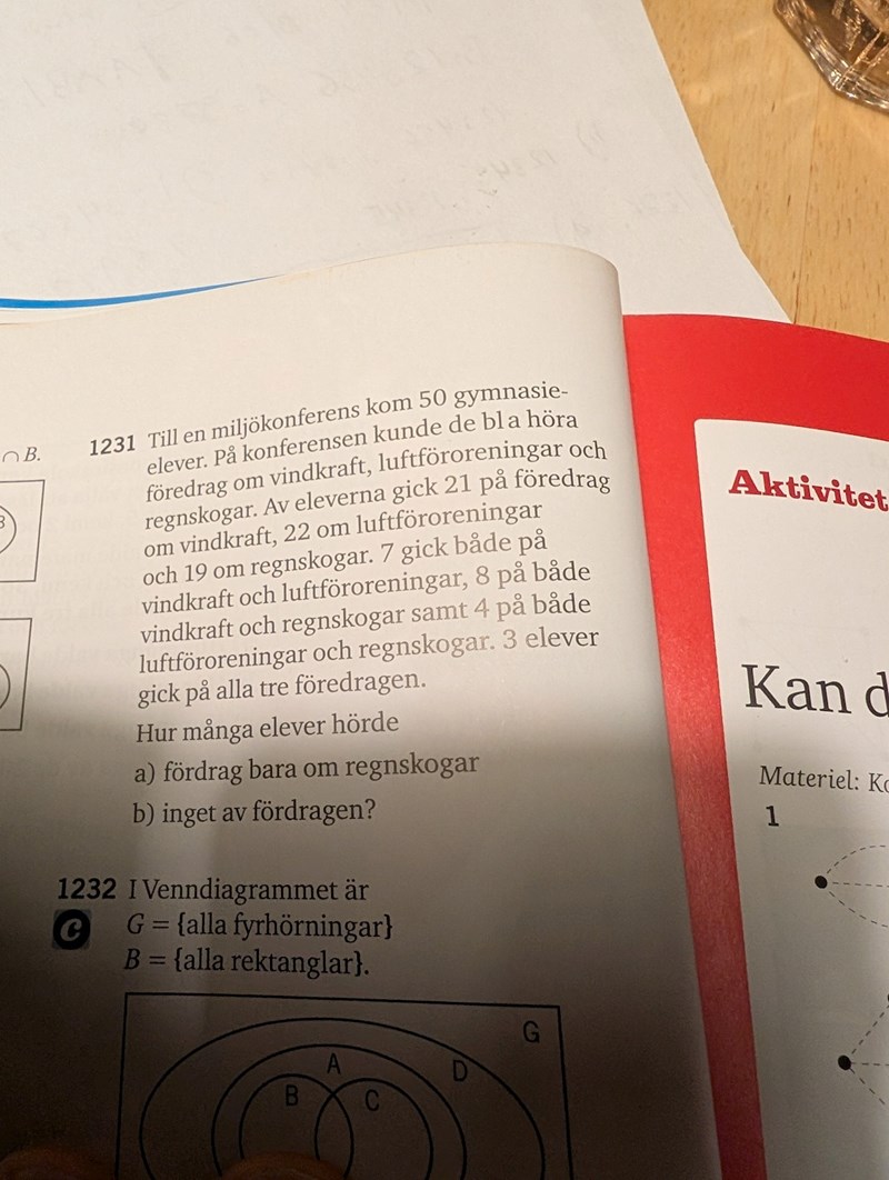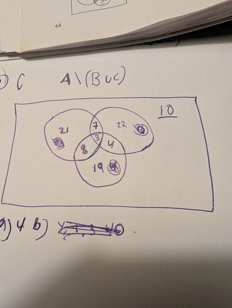 19 går på föredrag om regnskog, sen räknar man bort 8,3,4 från det eftersom de eleverna även gick på andra föredrag. Får det då till 4. Kollade i bokens exempel och dom har exakt samma strategi för att kolla hur många elever som har endast matte..