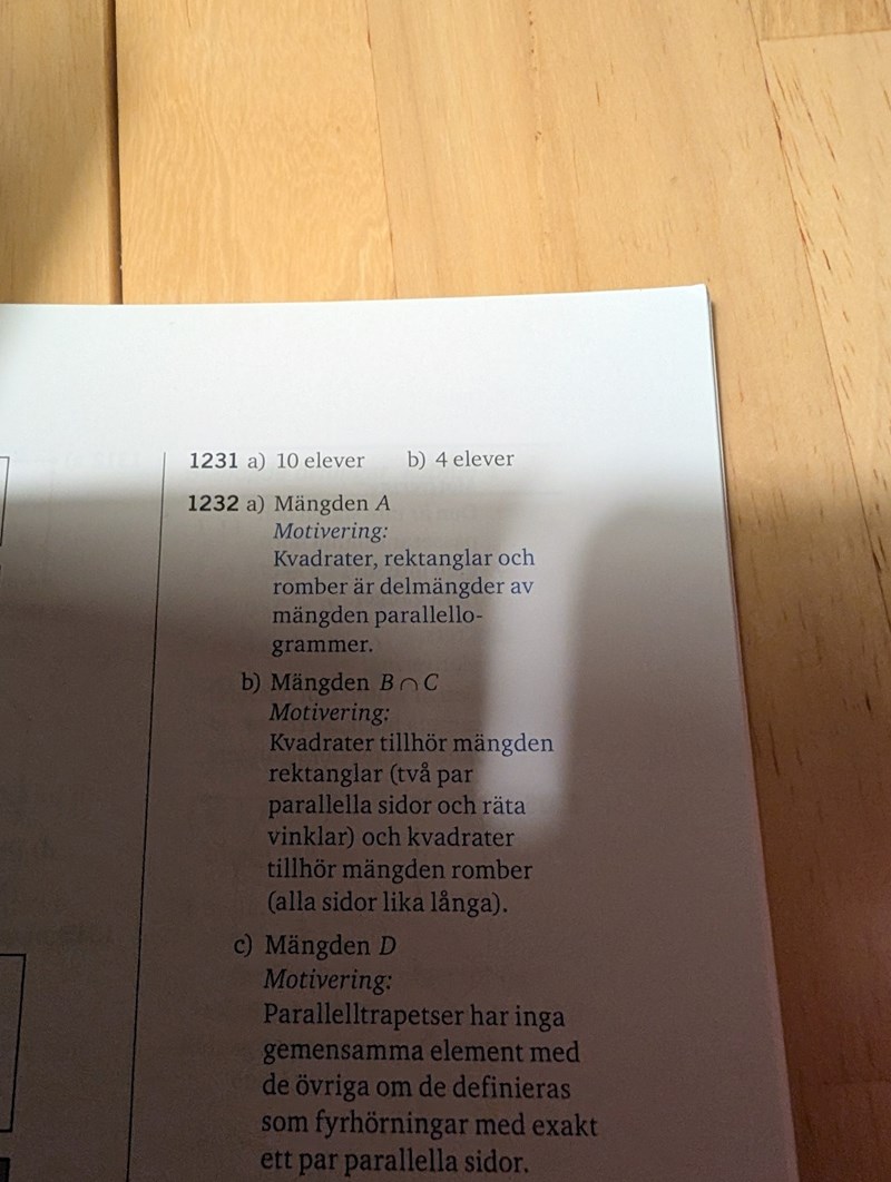 Dkcre skrev:Gustor skrev:På fråga a): Det gick 19 elever på föreläsningen om regnskog. Av dessa gick 8 st på både regnskog och vindkraft, så vi subtraherar dem. Vi behöver även subtrahera de 4 som gick på både regnskog och luftförorening. Då har vi för närvarande 19 - 8 - 4 = 7. Men notera att av de 8 som gick på regnskog och vindkraft ingår även de 3 elever som gick på alla tre föreläsningar. Detsamma gäller siffran 4 elever som gick på både regnskog och luftförorening. När vi därför gjorde beräkningen 19 - 8 - 4 så har vi dragit bort de 3 elever som gick på alla tre föreläsningar två gånger: en gång när vi tog -8 och en gång när vi tog -4. Vi vill bara ta bort dem en gång, så därför lägger vi till 3, och får