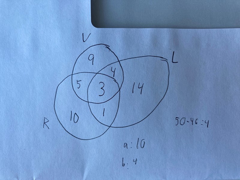 Vill vi sedan se hur många som inte deltog i någon föreläsning får vi ta antalet elever minus alla undergruppering av föreläsningsdeltagare och vi får 50-9-5-4-3-10-1-14= 50-46= 4.