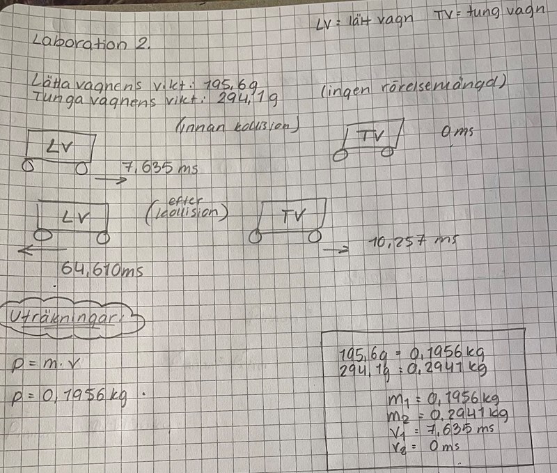 novish skrev:Uppgiften kom dock från en video där läraren låter två vagnar krocka med varandra (en av dem står still) och han säger att en av vagnarna rör sig i hastigheten 7,635 millisekunder. Vi får även hastigheterna på båda vagnarna efter kollisionen där han säger att vagnen med 7,635ms som hastighet rör sig tillbaka i hastigheten 64,610ms. (Den ex-stillastående vagnen får då hastigheten 10,257ms framåt). Vikterna av vagnarna är givna i gram också. Sen ska man beräkna hur mycket rörelsemängd som bevaras.