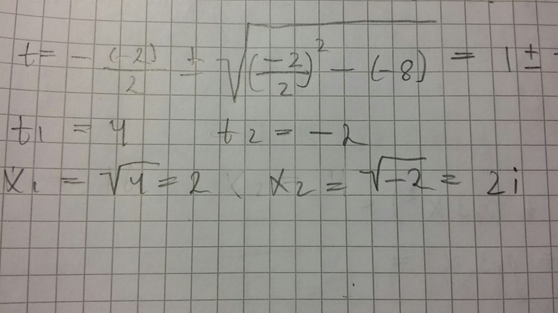 Jag inser nu att jag upphöjde variblerna t1 och t2 med 2, istället för att ta roten ur dem, fast nu är jag lite förvirrad, eftersom X2 blir ju roten ur -2, bör det inte den andra lösningen till ekvationen då vara 2i?