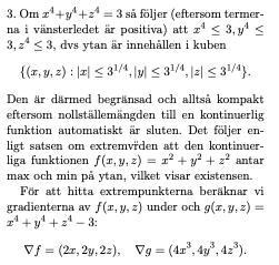 Freewheeling skrev:Funktionen ger, som du säger, avståndet från origo till en punkt och det är precis denna funktion som du vill maximera resp. minimera på ytan . Satsen om extremvärden säger att en kontinuerlig funktion definierad på ett kompakt område kommer anta att maximum och ett minimum på detta område. Eftersom att är kontinuerlig överallt och ytan utgör ett kompakt område så följer det att kommer anta ett maximumvärde och ett minimumvärde på ytan .