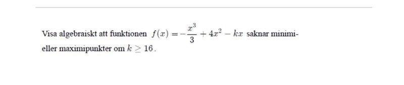 Ja det gjorde jag. Sedan satte jag derivatan lika med noll och insåg m.h.a pq-formeln att diskriminanten blir 16-k. Fast det jag undrar är att om k=16 så får vi 0 då blir det en dubbelrot, men är det större än 16 så saknas det lösningar. Hur ska man tolka det nu då enligt frågan?
