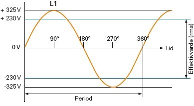 ; vilket framgår av bilden (toppen av sinuskurvan) Då blir V = 230 V , effektivvärdet, vilket vi känner igen ifrån våra vägguttag.