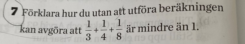 Du kan konstatera att 1/4 < 1/3 och att 1/8 < 1/3, så 1/3 + 1/4 + 1/8 < 1/3 + 1/3 + 1/3 = 1. Fast det kanske räknas som en beräkning i sista steget?