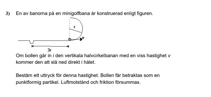 Räkna bakifrån. När bollen lämnar halvcirkeln upptill, vilken hastighet v2 ska den ha för att landa i hålet?