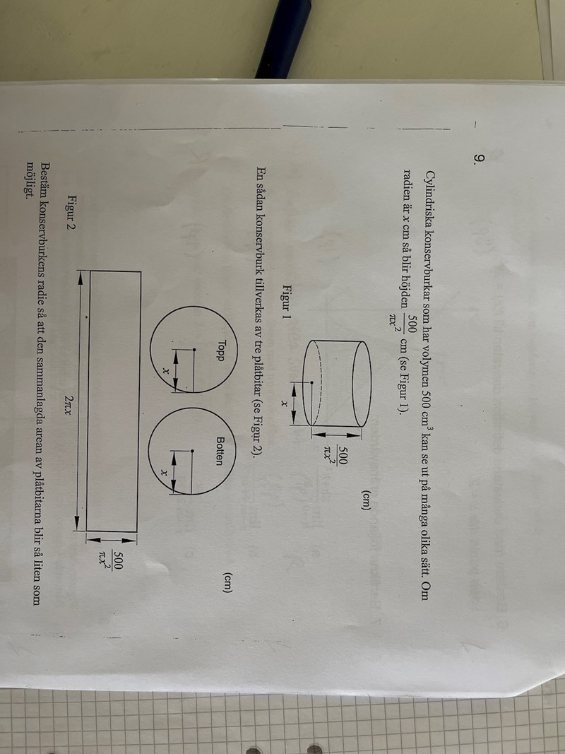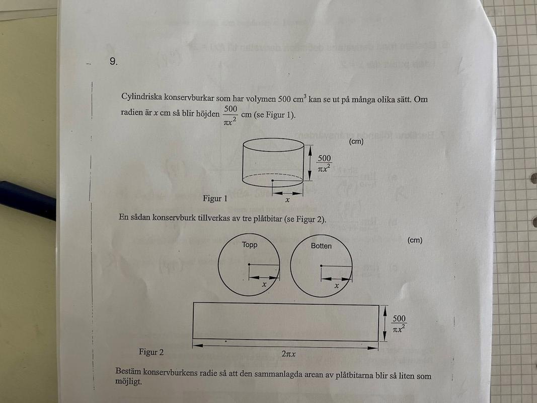 Börja med att teckna ett uttryck för konservburkens area, dvs summan av mantelytan och de två lockens area, uttryckt i x enligt figuren i uppgiften