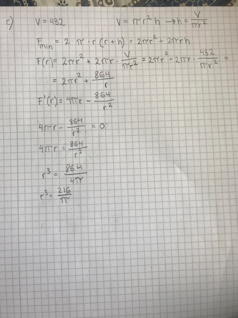 En konservburk ska konstrueras. Volymen ska vara V=432 och konservburken ska ha så liten yta som möjligt för att spara material. Vilken är den minsta ytan F som en konservburk med V=432 kan ha?