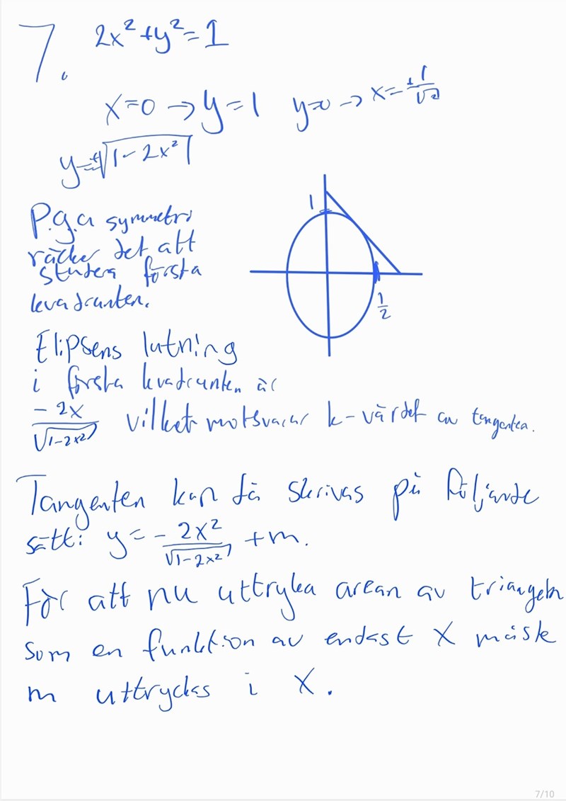Men vi kan sätta in en punkt på kurvan, som vi kan kalla . Vi hade kommit fram till att ellipsens ekvation i kvadrant ett kan skrivas som . Då måste en punkt på kurvan vara . Insättning av denna punkt ger oss att: