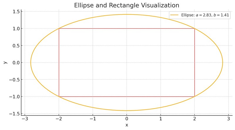 Jag vet att arean av en ellips är , men jag vet inte hur jag ska hitta värdena på och . Är inte den grundläggande idén att lösa problemet genom att substituera in hörnen av rektangeln?