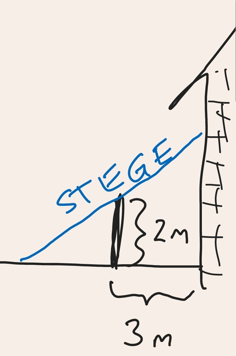 Yngve skrev:Schnehest skrev:Korra skrev:Schnehest skrev:Ett 2 m högt plank står på avståndet 3 m från en vägg. Bestäm den kortaste längd en stege måste ha för att nå från markplanet till väggen över planket (Vägg/plank är horisontella)