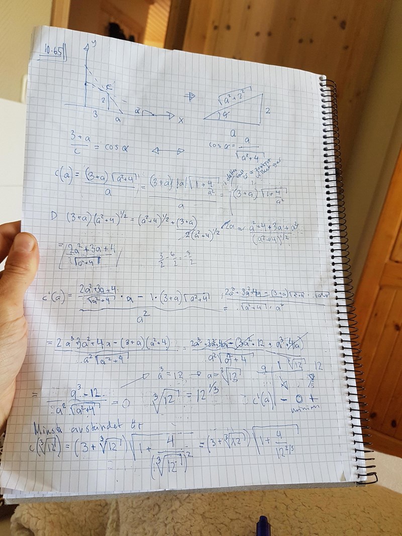 Smaragdalena skrev:Min första tanke var att det skulle gå att lösa uppgiften med likformighet, Pythagoras sats och pq-formeln (därför flyttade jag tråden till Ma2) men nu tror jag snarare att man behöver använda sig av trigonometriska funktioner och derivata, så därfär flyttade jag tråden en gång till så att den ligger i Ma4 nu.