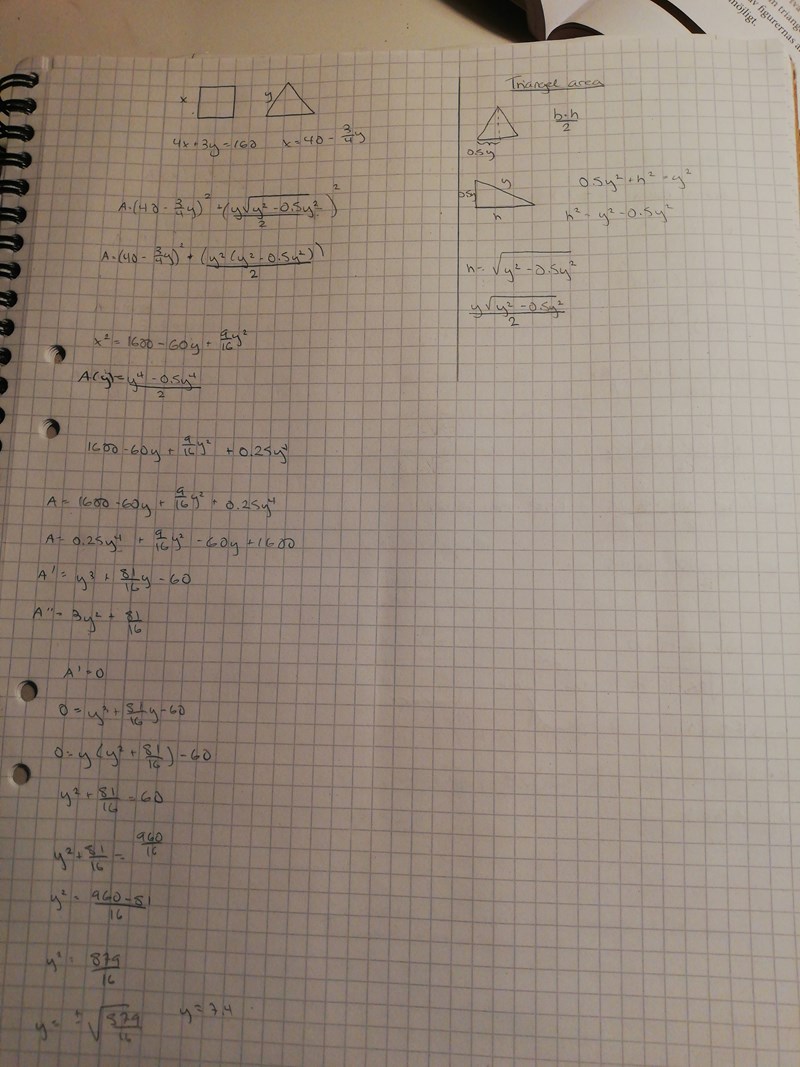 Yes nu funkar det. Jag får då att A= 25 600 - 960y +9y^2 + 4y^2