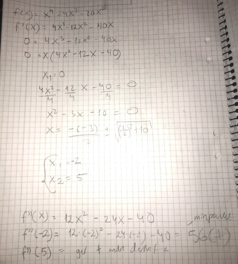 Men du har hittat de båda minimipunkterna x=-2 och x=5. Det ser du om du ritar upp funktionen f(x)=x^4 -4x^3-20x^2 i ett koordinatsystem.