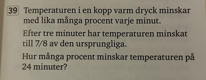 Anm. Modellen är litet skum. Temperaturen minskar med en åttondel på tre minuter. Vad är nollpunkten? Om chokladen var 47°C från början minskar den med ungefär 6 grader på tre minuter. Men 47° C är lika med 320 grader över absoluta nollpunkten, utgår vi från den minskar temp med 30 grader de första tre minuterna.