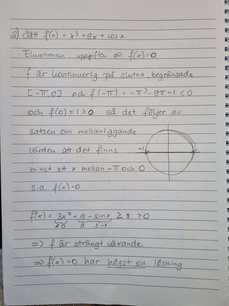 Frågan såg exakt ut som den nedan fast istället för 1 var det +cosx har en exakt lösning x mellan-pi och 0?