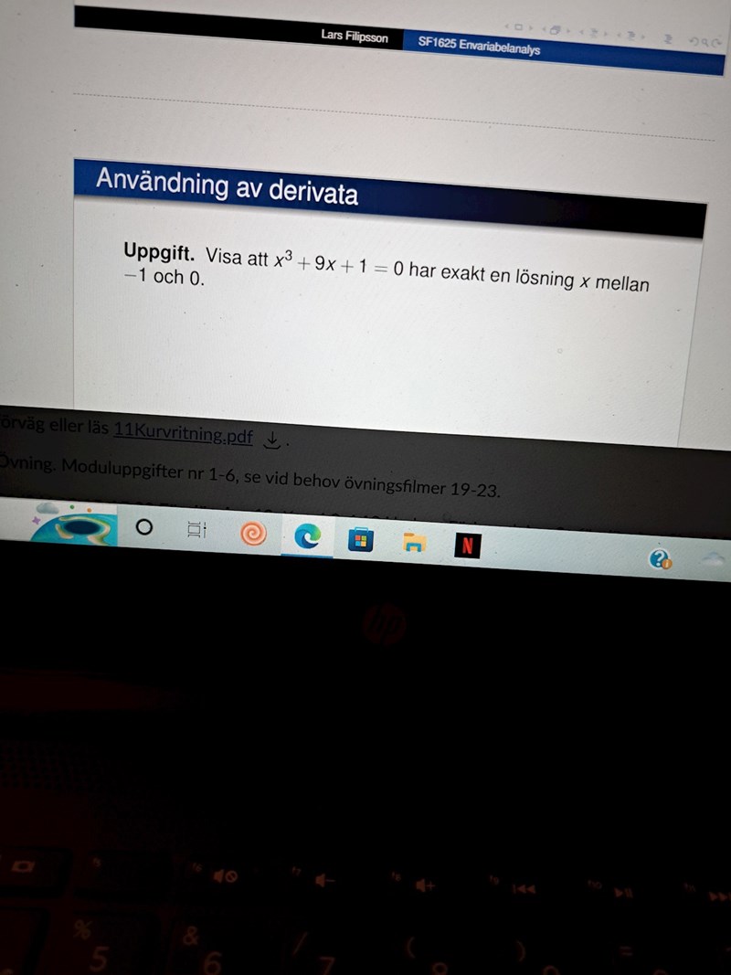 Så om x^3+9x+1 har exakt en lösning på det slutna intervallet [-1,0] så har den exakt en lösning på det öppna intervallet (-1,0).