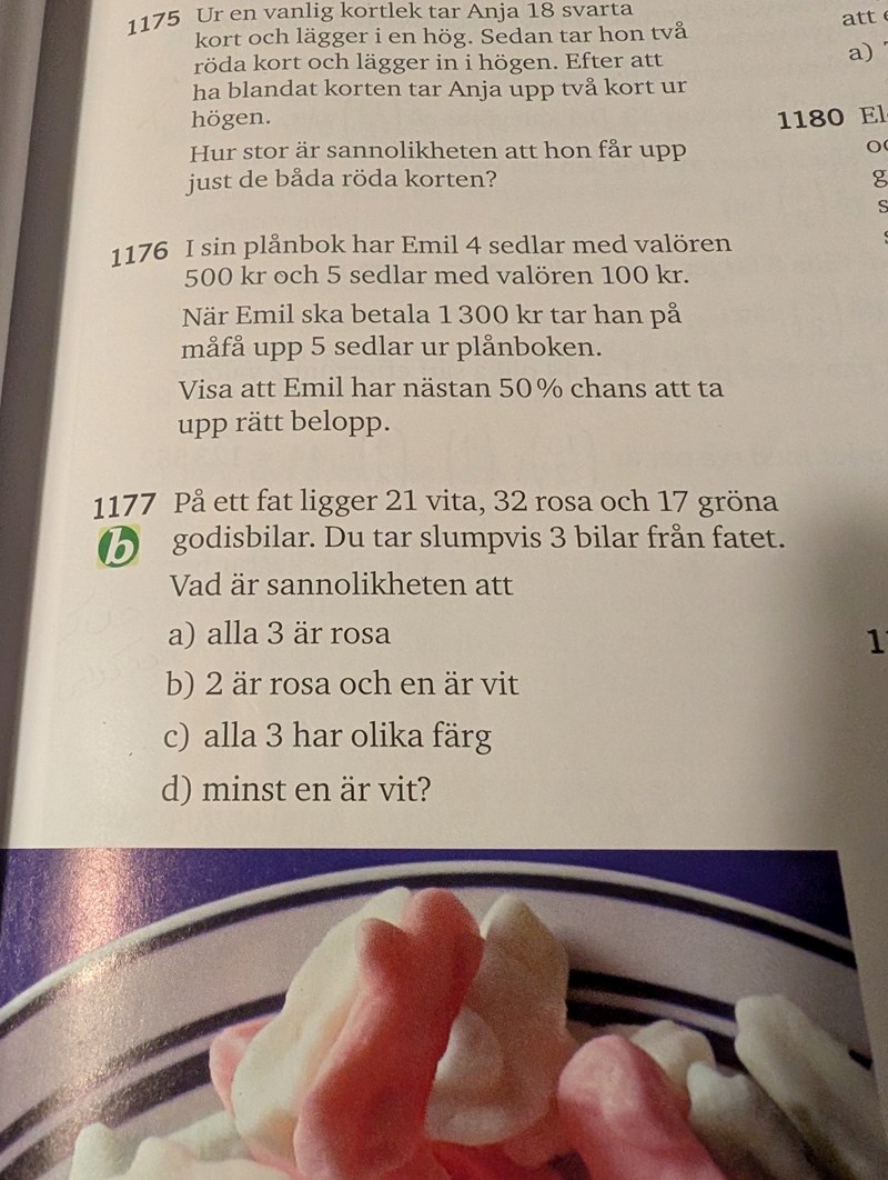 Jag summerade alla tänkbara sannolikheter för att inte få en vit godis, sedan subtraherade jag detta värde ifrån 1. Var fel och kommer inte på något annat sätt oavsett hur jag anstränger mig.