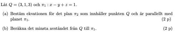 Börja med att ta fram en vektor från någon punkt på planet till . Sedan kan du projicera denna vektor på planets normal och sedan ta absolutbeloppet för att få den kortaste längden från planet till .