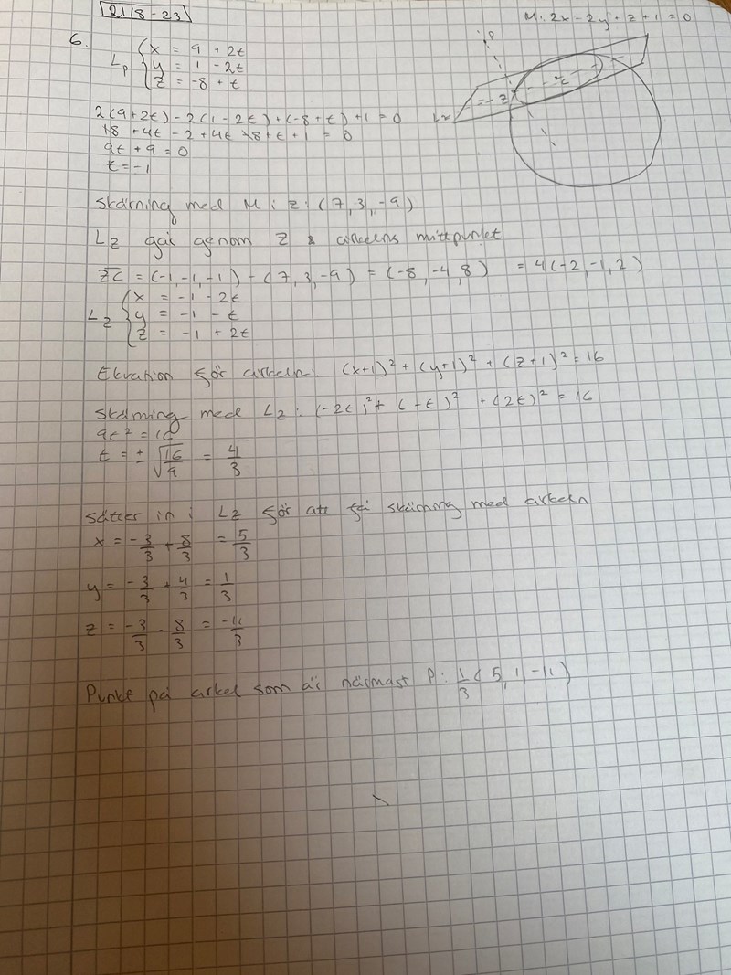 Hej, jag har gjort en uppgift och tänkte fråga om någon har ett bättre sätt att tänka på än mig. Jag har räknat ut det minsta avståndet från en punkt P till en cirkel. I sista steget har jag tagit fram en linje som går genom cirkelns medelpunkt och punkten som ligger rakt under P och undersöker när denna skär cirkeln. När jag ska ta fram t-värdet får jag ett positivt och ett negativt värde. Hur vet man vilket värde på t man ska välja? Jag tänker att man kan sätta in båda värderna och undersöka vilket som ger det kortaste avståndet till P men finns det något snabbare sätt? Jag lägger in en bild på min uträkning nedan.