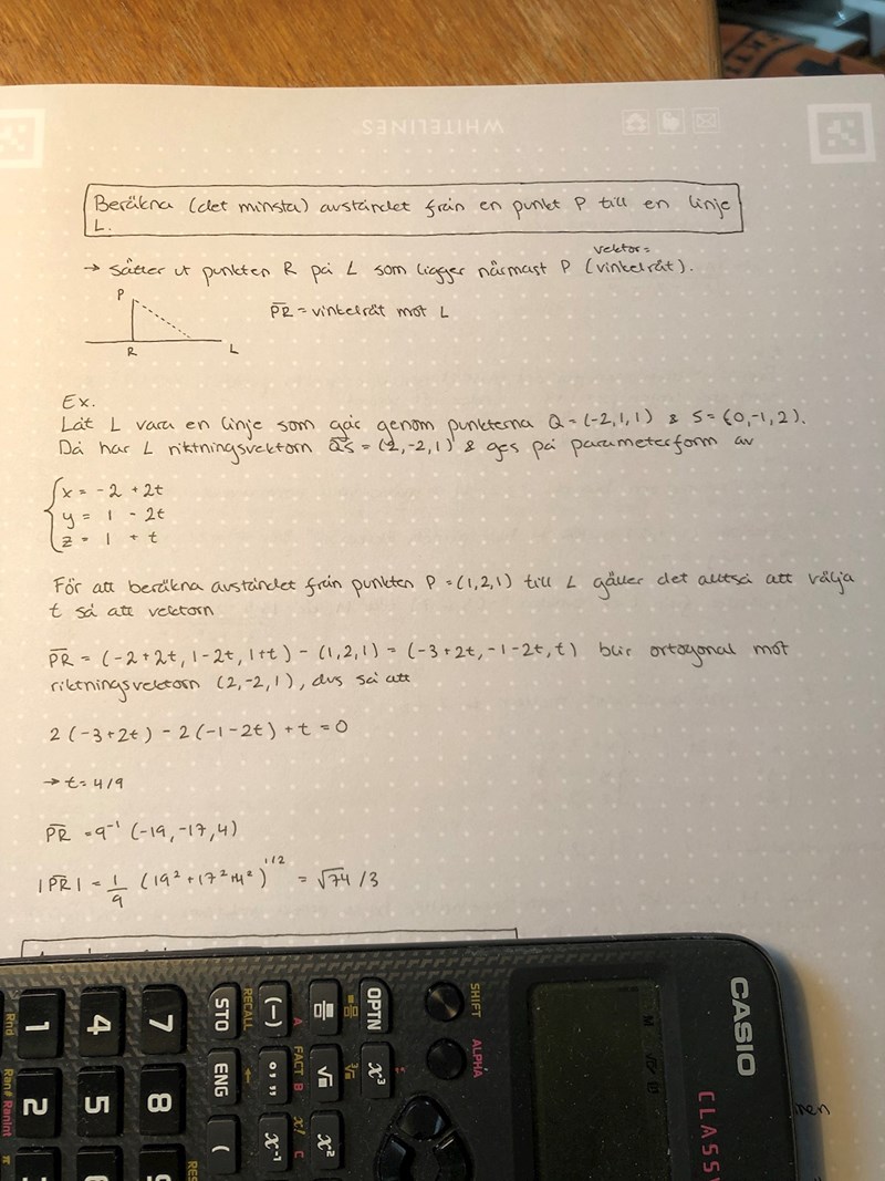 Hejsan, jag förstår inte hur sista biten av nedanstående uppgift går till. Jag hänger med på att t måste vara 4/9 så att sträckan PR blir ortogonal mot riktningsvektorn, men hur blir |PR|= (1/9)… och varifrån fås (-19,-17,4)? Vore väldigt tacksam för svar