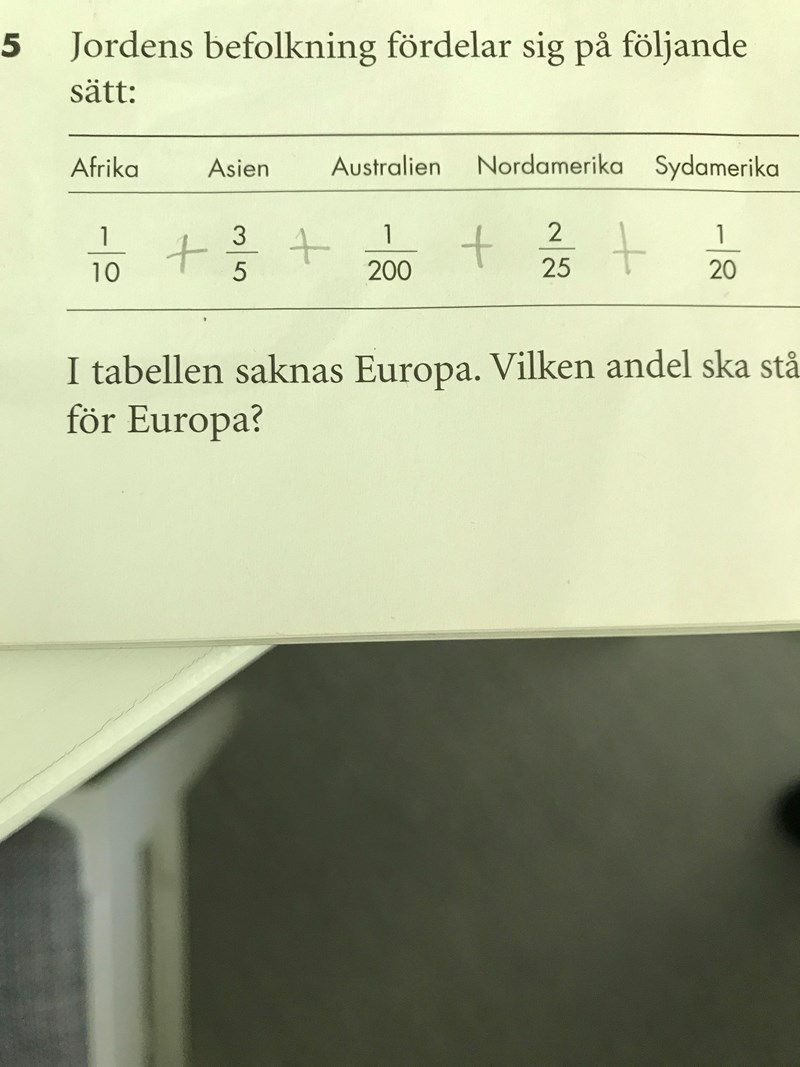 Man kan tänka i procent eller med bråk, det går med båda. Du måste inse att hela jordens befolkningen (summan av befolkningen i alla världsdelar, även Europa) är lika med 1 om du jobbar med bråk och 100% om du jobbar med procent. Sen ska du antingen omvandla alla bråk till procent om du löser det genom procent eller hitta den minsta gemensamma nämnare, i det här fallet 200. Sen kan du göra det enklare genom att addera alla de procent eller bråk och sen subtrahera dem med 1 eller 100%. I fall du måste ange svaret i bråkform och du har gjort uppgiften genom procent eller tvärtom kan du omvandla resultatet i både procent eller bråk. Det finns säkert fler sätt att lösa den här uppgiften.