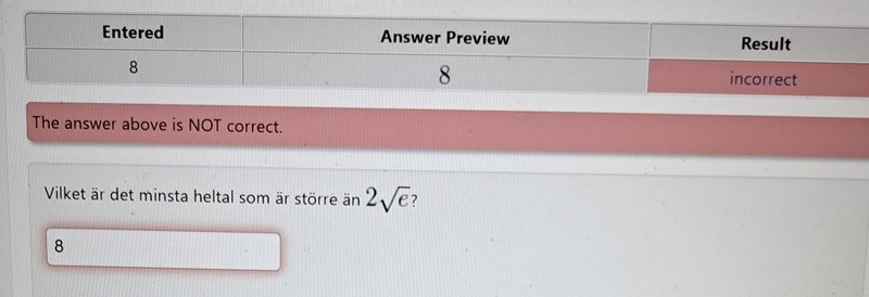 Ok. Men svaret kan ej vara 3 för man ser ju att 2sqrt(e)är nära 2sqrt(3)