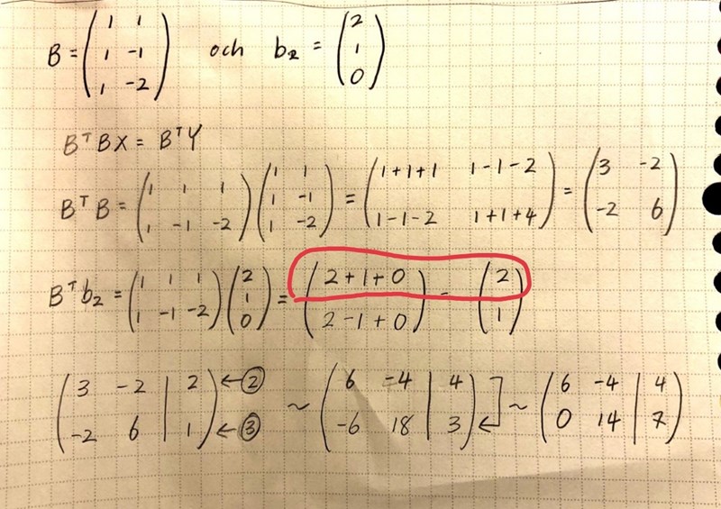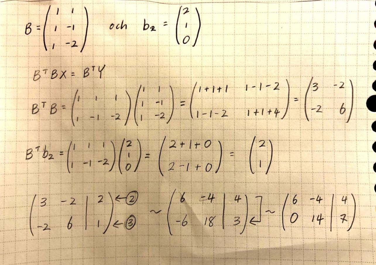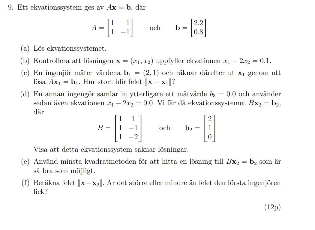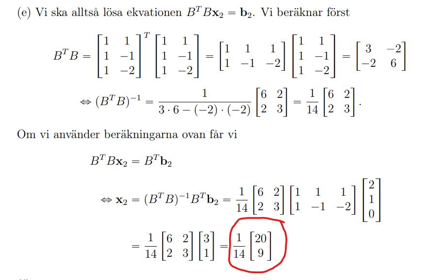Jag behöver hjälp med uppgiften e), där ska vi användar minsta kvardratmetoden för att hittar den närmaste lösningen till en E.S som saknar lösning.