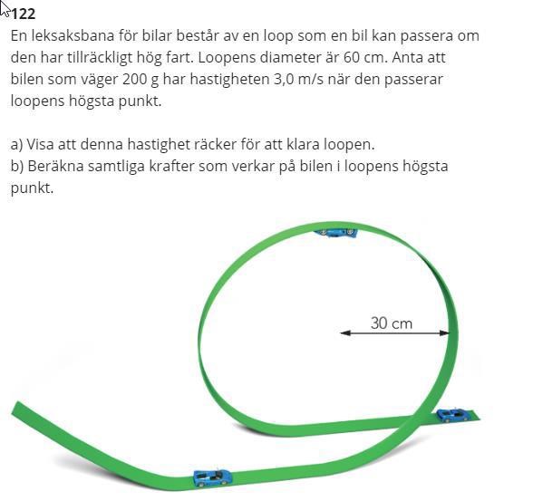 Jag kommer dock inte riktigt ihåg resonemanget bakom detta, beror det på att just när bilen är i loopens högsta punkt, rör bilen knappt banan och därför finns ingen normalkraft? Enda anledningen till varför bilen fortsätter i loopen är pga netwons första lag( tror jag) att bilen vill fortsätta röra sig framåt i en rak riktning pga den konstanta hastigheten som är tillräcklig för att den inte ska falla av banan..?