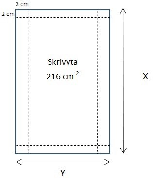 Då tar jag ett par steg tillbaka. Då skulle jag sätta skrivytans bredd till , skrivytans längd till . I så fall gäller det att och . Papprets yta är och det är den som man skall beräkna det minsta värdet för.