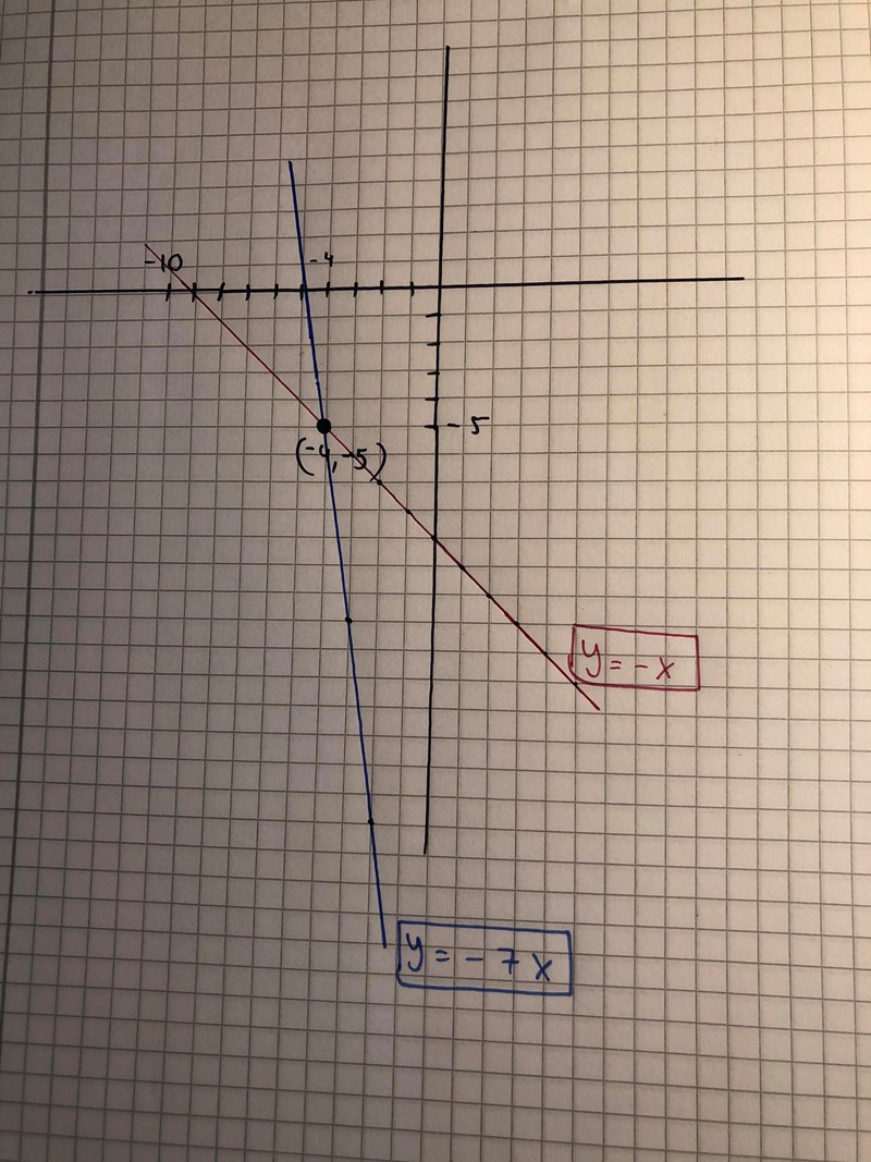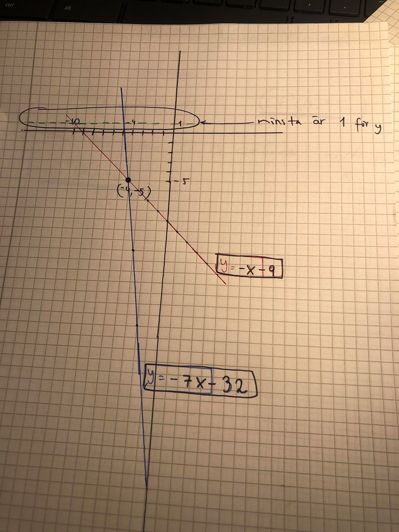 (Fast det stämmer inte att y = -x utan att y = -9-x för den röda linjen, och den blå linjen är något i stil med y = -32-7x.)