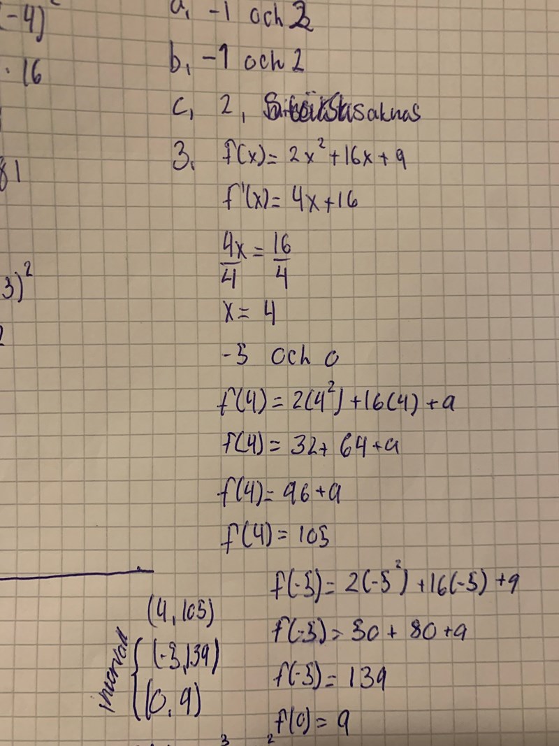 Låt f(x)=2x2+16x+9. Bestäm funktionens minsta och största värde i intervallet -5x0