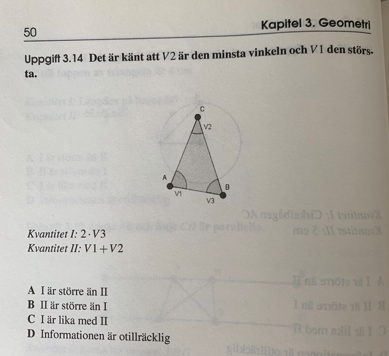 Om vinklarna skulle ha detta utseende är kvantitet II större I. Vi har nu hittat två olika vinkeluppsättningar som uppfyller uppgiftens krav, men som ger olika svar. Därmed kan vi sluta oss till att informationen inte räcker. :)