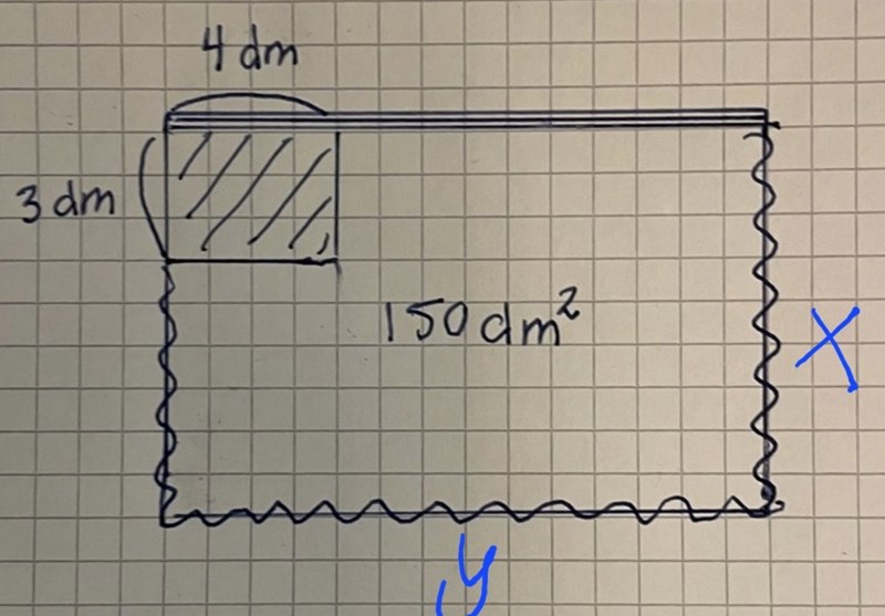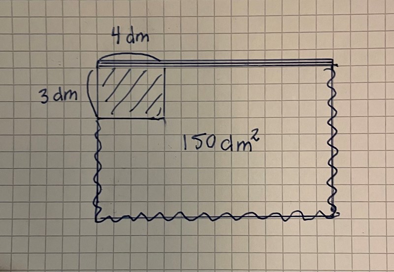 En hage ska inhägnas med staket. En del av hagen (den övre) ligger mot en mur så där behövs inget staket. Sedan finns det också ett stall i hagen (streckade området) så om stallets vänstra sida behövs inget staket. Hagen behöver ha arean 150dm^2. Vilken är den minsta mängd/längd staket man behöver för att inhägna hagen?
