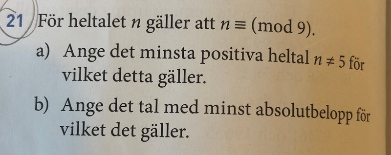 Bedinsis skrev:Måste vara feltryck. Eftersom de specificerar att n ej är 5 antar jag att de menade att n är 5 mod 9.